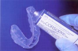 Fluorid stärkt die Widerstandskraft der Zähne gegen Karies. Es wirkt vor allem durch direkten Kontakt mit den Zähnen. Die so genannte systemische Fluoridierung, also die Fluoridzufuhr vor dem Zahndurchbruch, z. B. durch Tabletten, wird heute als weniger wichtig betrachtet. Fluoridiertes Speisesalz und Fluorid-Zahnpasta bilden die Basisfluoridierung. Fluorid-Gelee, -Spüllösungen und -Lacke können diese ggf. ergänzen. | ![]() Anwendung eines Fluor-Lackes bei der Schmelzfluoridierung mittels Fluoridierungsschiene |